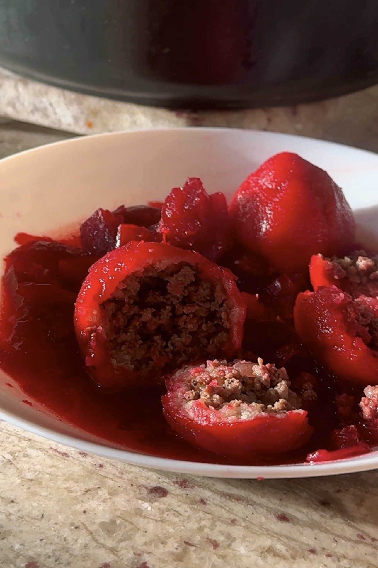 ובפנים מילוי בשר עסיסי בטירוף, מלא בצל וירק, שספג את כל הטעמים של המרק.